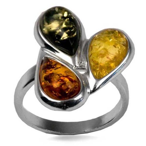 Bague Femme Trois Gouttes - Argent 925/1000 - Ambre Multicolore Amber by Graciana - 40128 - Bague Femme Marquise en Forme Ambre Bague polie de largeur moyenne